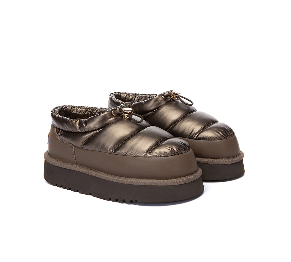 - Down-filled padded fabric upper with leather overlay creates a soft, cosy winter look.