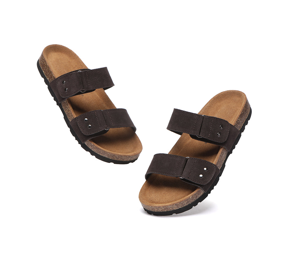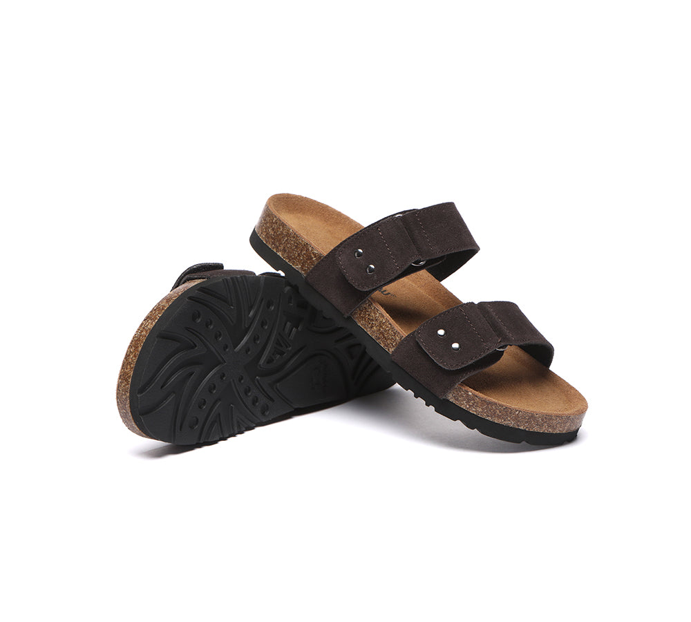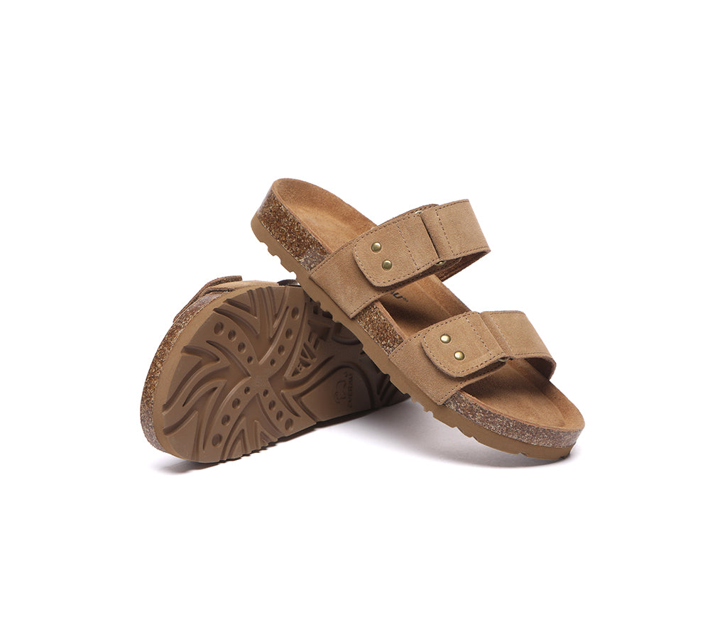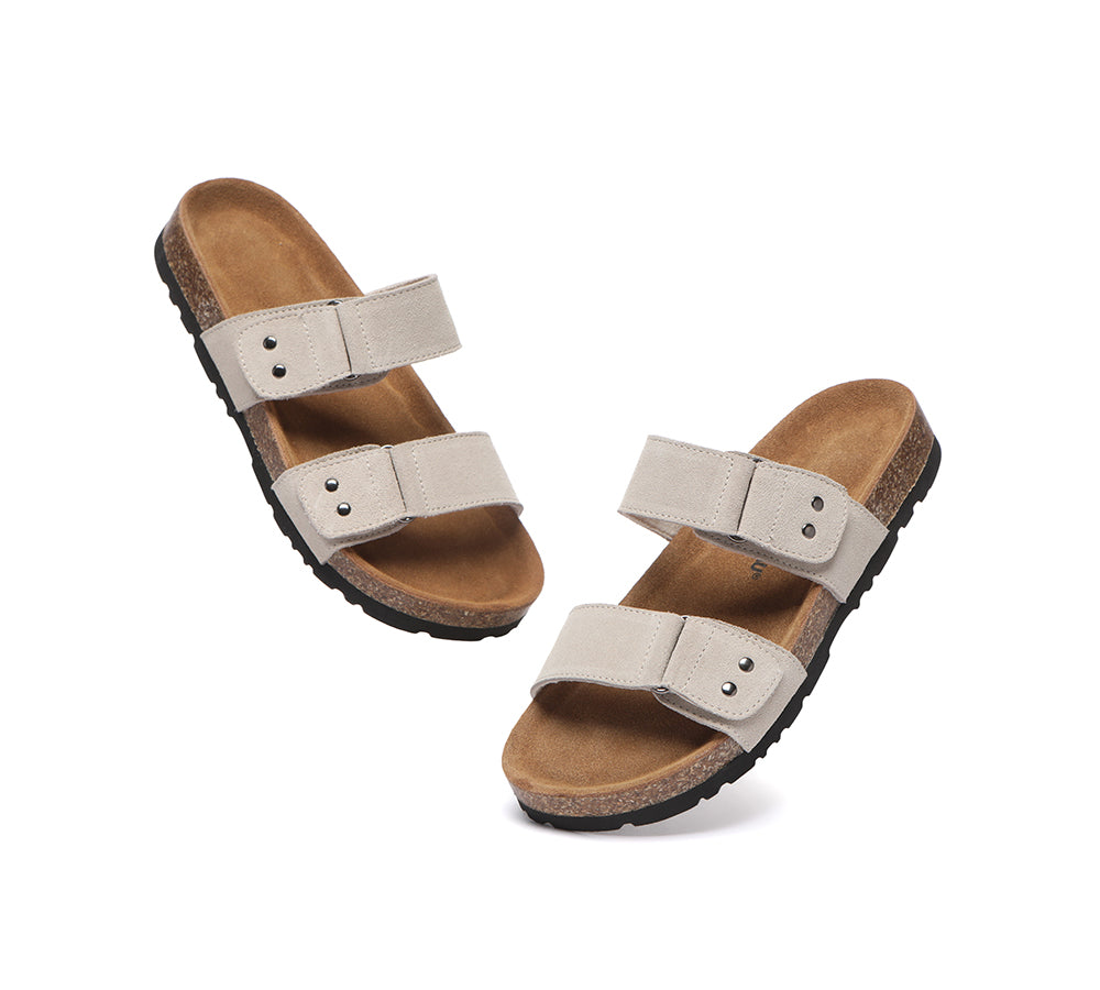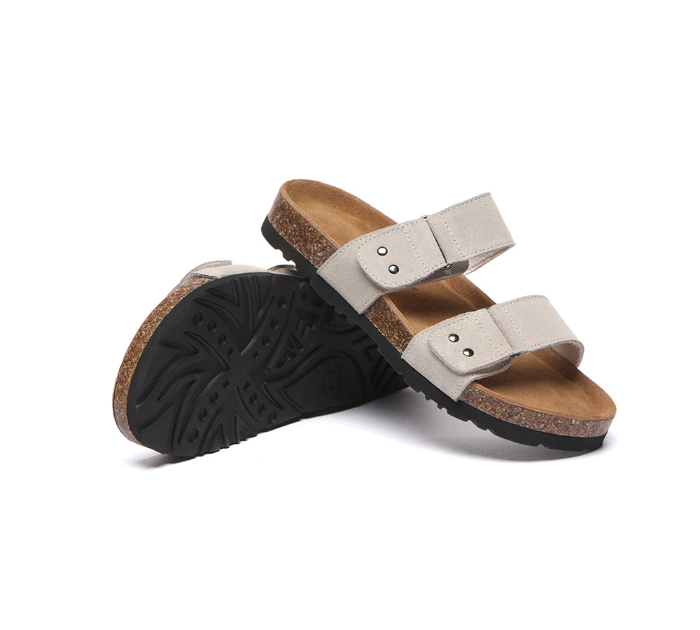 - Soft cow suede upper shapes classic two strap sandals.