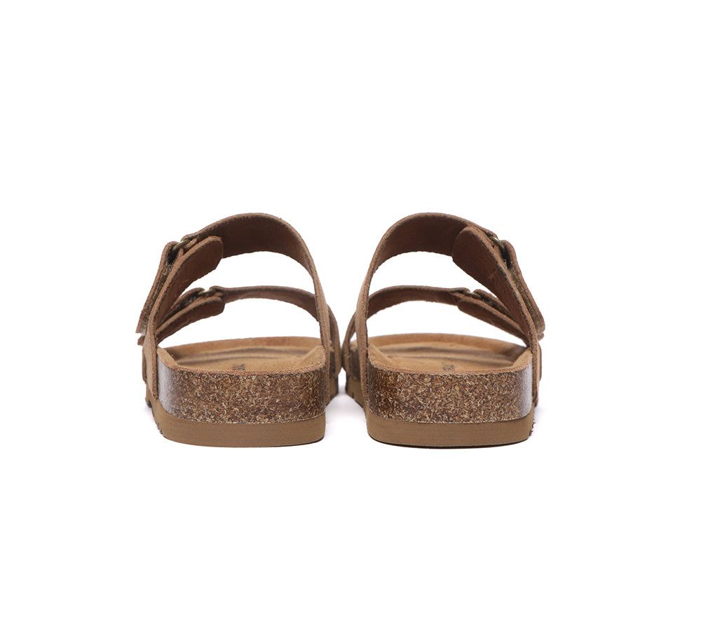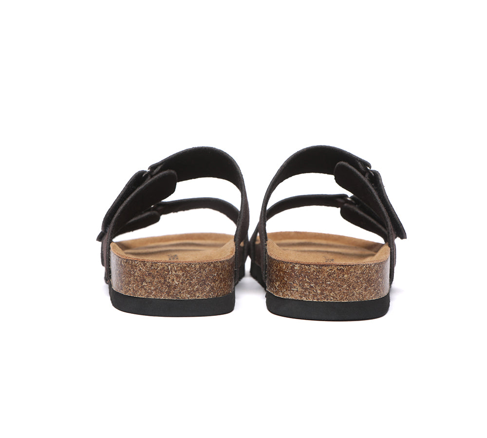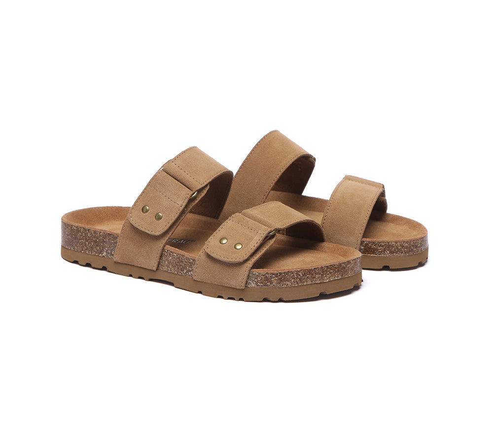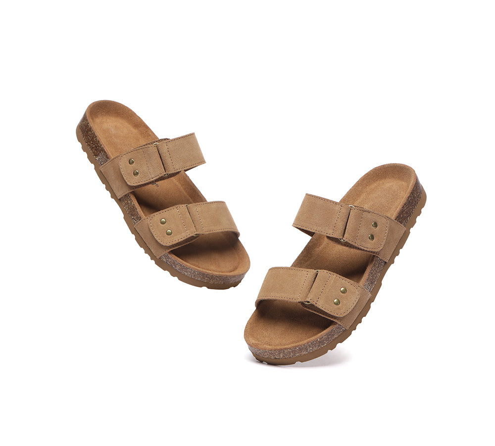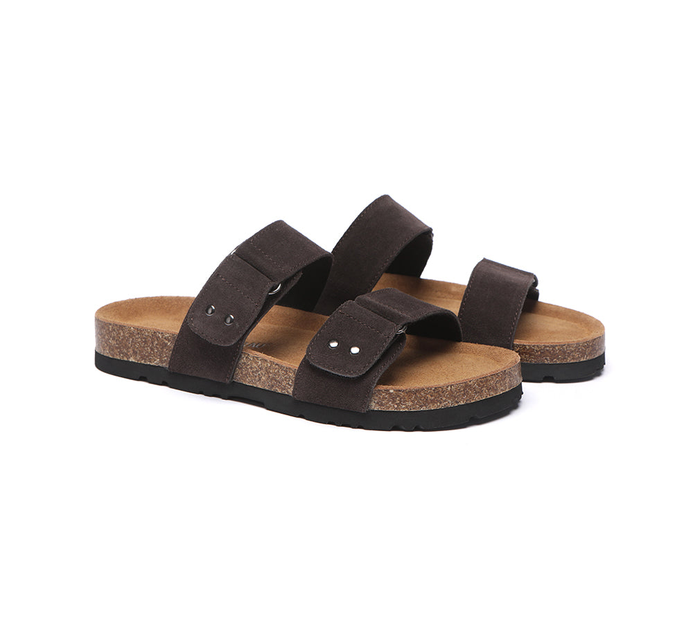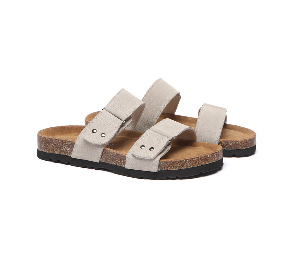 - Soft cow suede upper shapes classic two strap sandals.