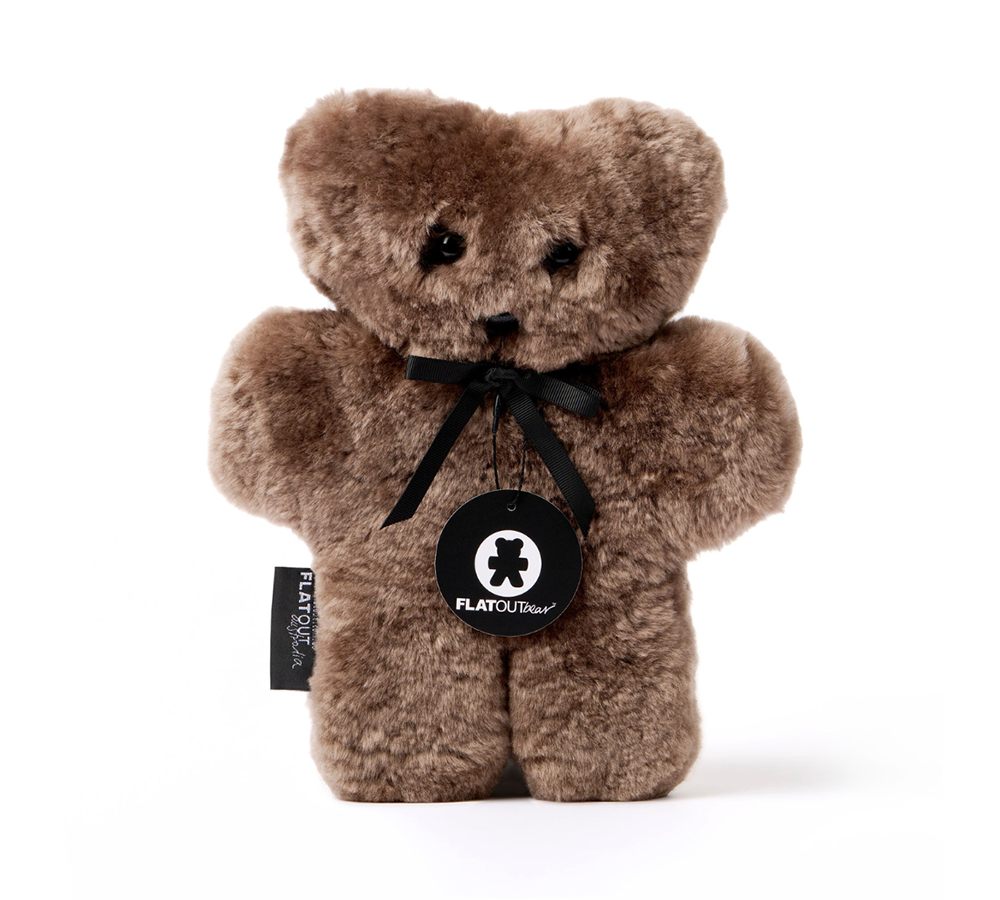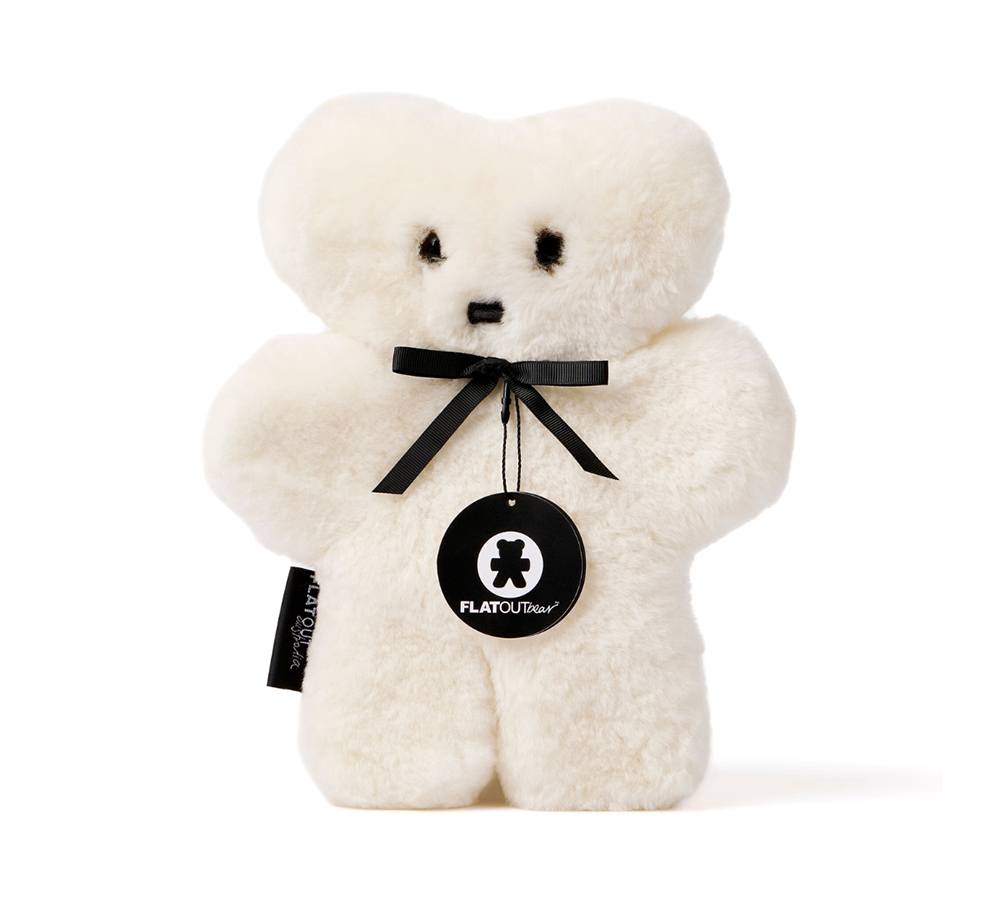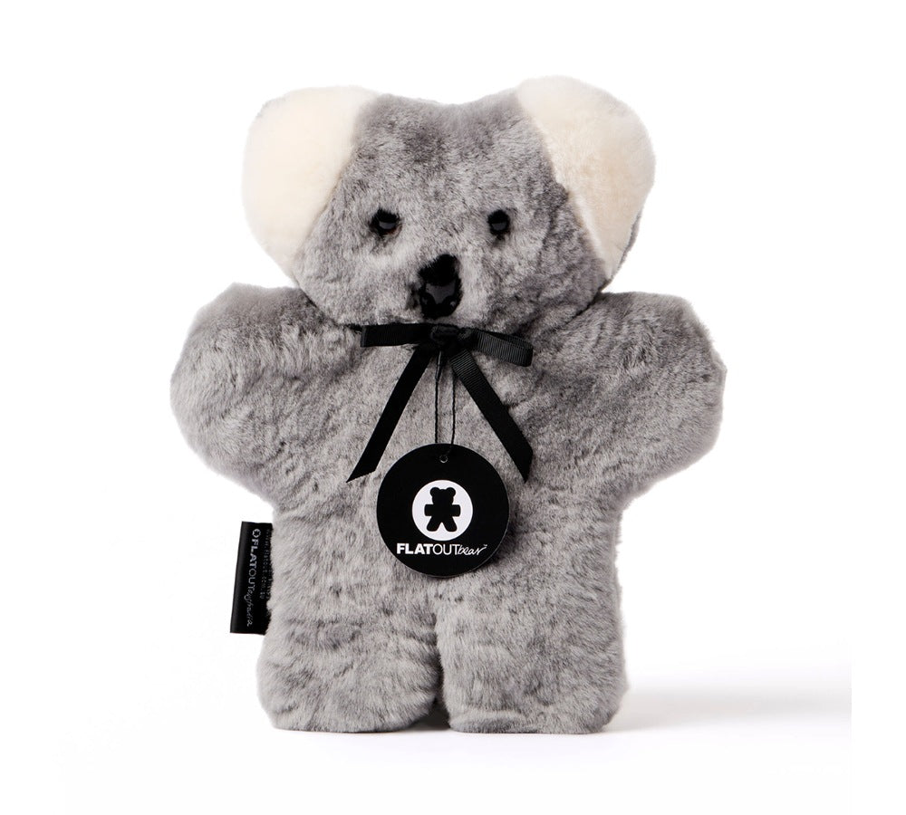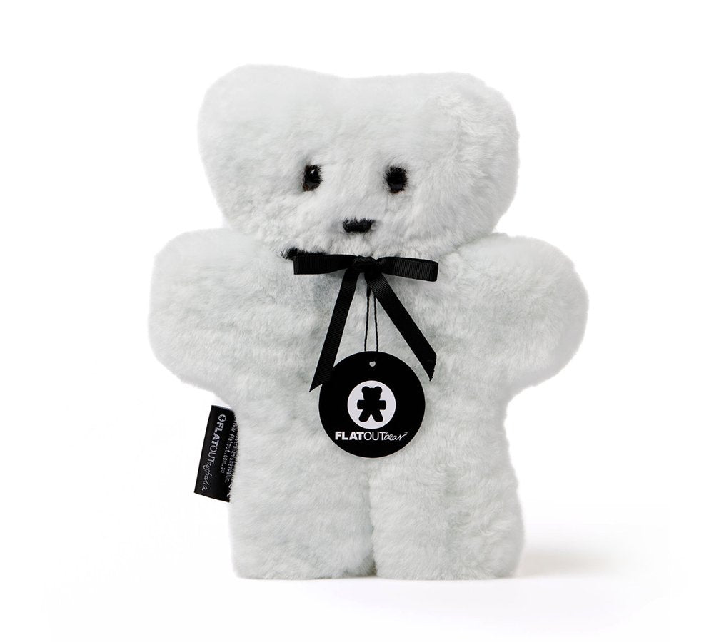 Soft, cuddly, and flat, the Genuine FLATOUTbear is handmade in China from Australian sheepskin shaped like a teddy bear.